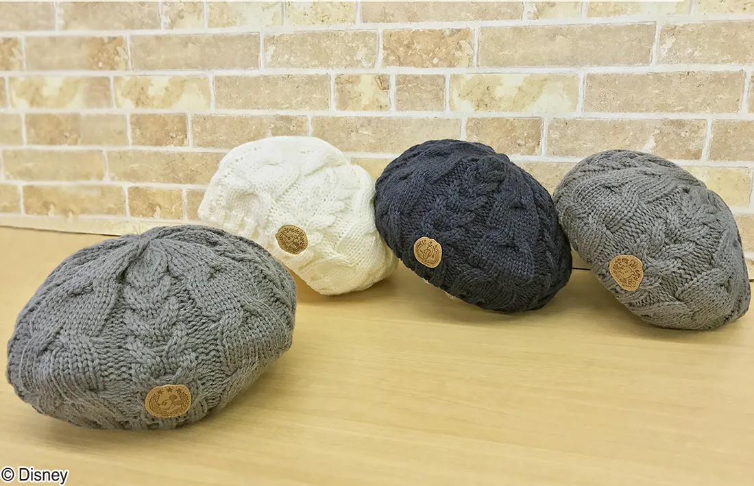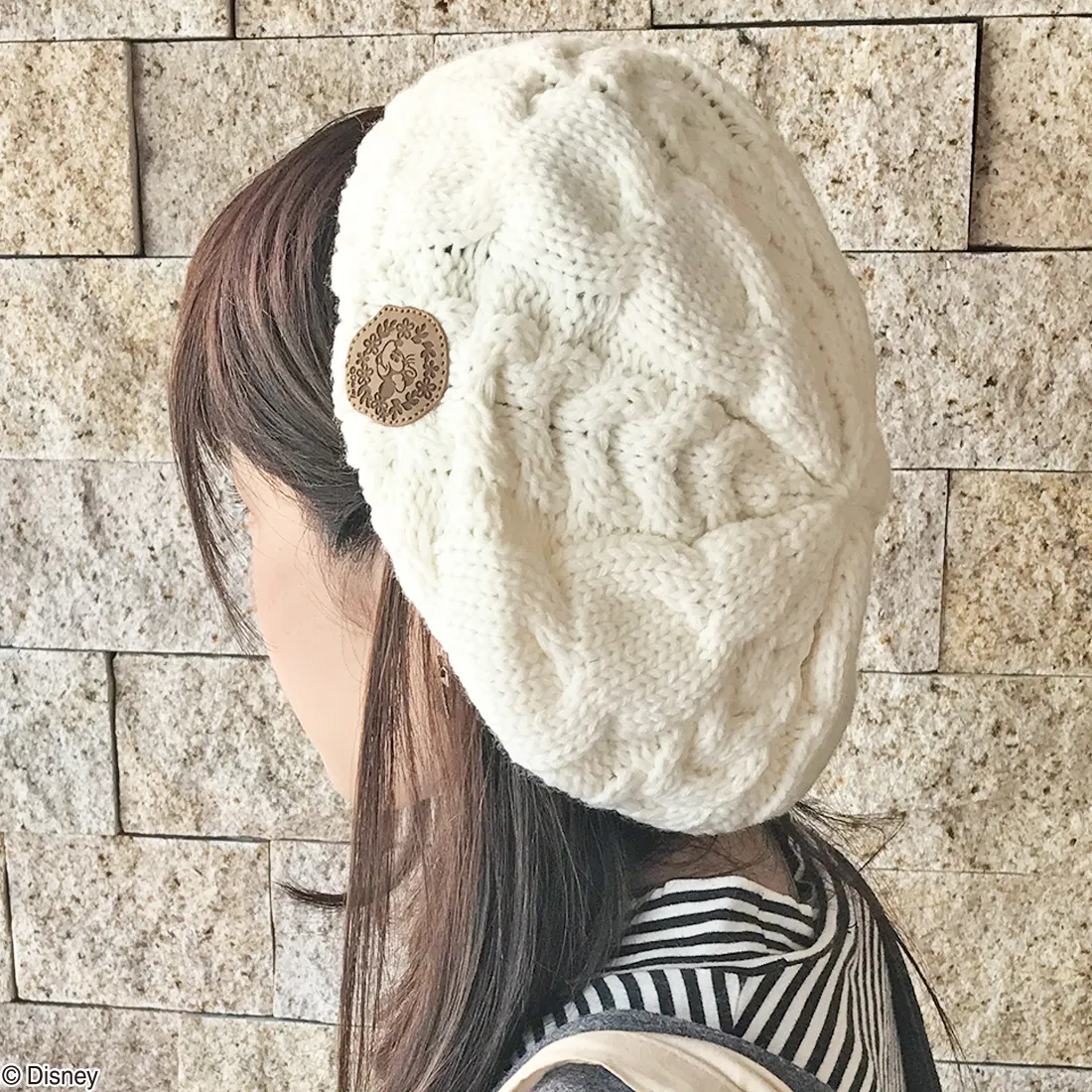 今年のトレンドのひとつであるベレー帽。ざっくり編まれたケーブル模様はナチュラルな印象。ベーシックな3カラー展開で、どんなコーディネートにも合わせやすいのがポイントです。ミッキー、ミニー、ドナルド、プーさんが型押しされた合皮レザーパッチが、絶妙に大人っぽいアクセントになっています。