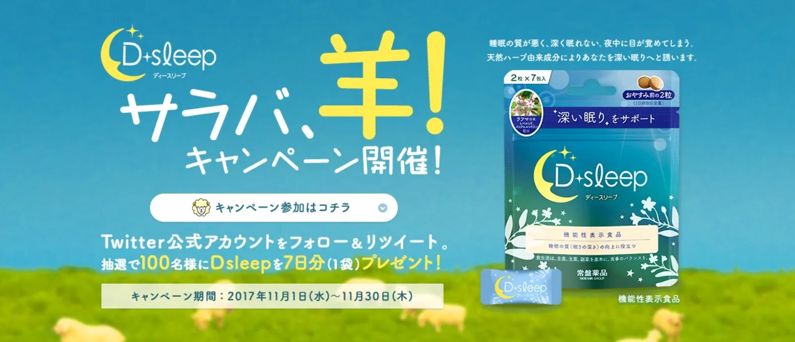 ノエビアグループの常盤薬品工業株式会社(本社:東京都港区)は、2017年10月5日に“睡眠の質”を向上するサプリメント(機能性表示食品)『D sleep(ディースリープ)』を発売いたしました。このたび11月1日(水)より、商品をお試しいただけるTwitterフォロー&リツイートキャンペーン“サラバ、羊!キャンペーン”をスタートします。