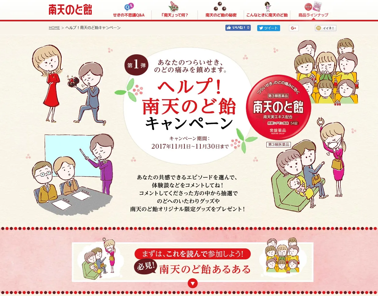 『南天のど飴』の特設サイトの選択肢から、「こんな時『南天のど飴』があればなぁ」と共感できるシチュエーションを選んで、キャンペーンへの一言や体験談など