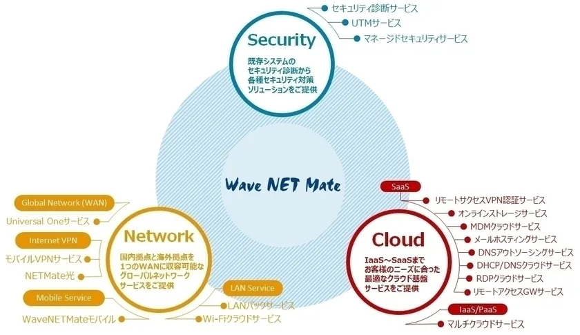 “WaveNETMate”は、主力サービスとしてISMSクラウドセキュリティ認証(ISO27017)を取得した「マルチクラウドサービスタイプCP」とセキュアな無線LANをアクセスポイント1台からスモールスタート可能な「Wi-Fiクラウドサービス」を展示ブース内でご紹介いたします。