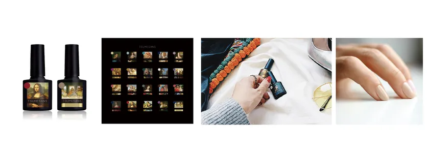 「ルネッサンス」と「ツメ」をかけて「ツメサンス」という名前にしました。ルネサンス期の芸術をイメージしたカラーバリエーションのほか、ジェルのボトルデザインには「モナリザ」や「最後の晩餐」などを使用しました。置いてるだけでも可愛いボトル、そしてフォトジェニックを意識しました。