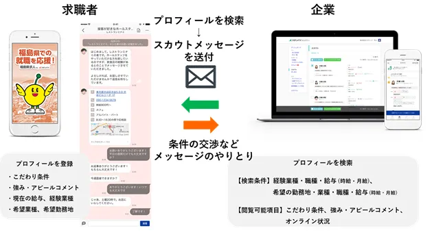 また、求職者が本アプリで経験業種や強み・アピールコメント等の簡単なプロフィールと希望条件(給与・業種・勤務地)等を登録するだけで、その求職者に興味をもった企業から「スカウト」が届きます。その後、求職者は企業と条件に関することなどをチャットで質問や確認することができ、面接前から柔軟でスピーディーな交渉が可能です。この他、企業からスカウトされた場合は、スマートフォンで動画面接も行えます。これにより求職者は仕事探しの手間を省けるだけでなく、自分では探せなかった仕事や条件に出合える可能性が高まります。特に、東日本大震災の影響により、現在も避難地域に移住している求職者が、震災前に住んでいた地元地域など遠隔地の求人を探している場合、スマートフォンを使って遠い地域の求人を探せるだけでなく、採用面接も多額の交通費をかけて移動することなく受けることができます。同時に企業も、求職者からの応募を待つだけでなく、スカウトすることで直接求職者にアプローチできるため、スピーディーな採用と、それまでリーチできていなかった求職者層との接点を持つことが可能になります。