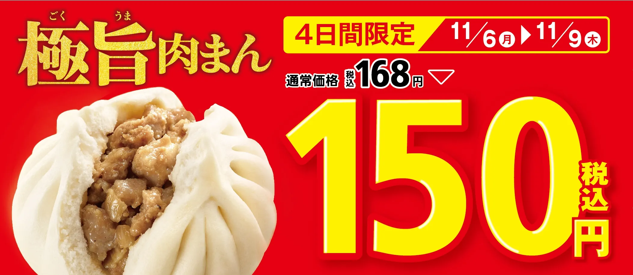 気温が大幅に下がり中華まんの需要が高まる季節に合わせ、「極旨肉まん」150円セールを実施します。