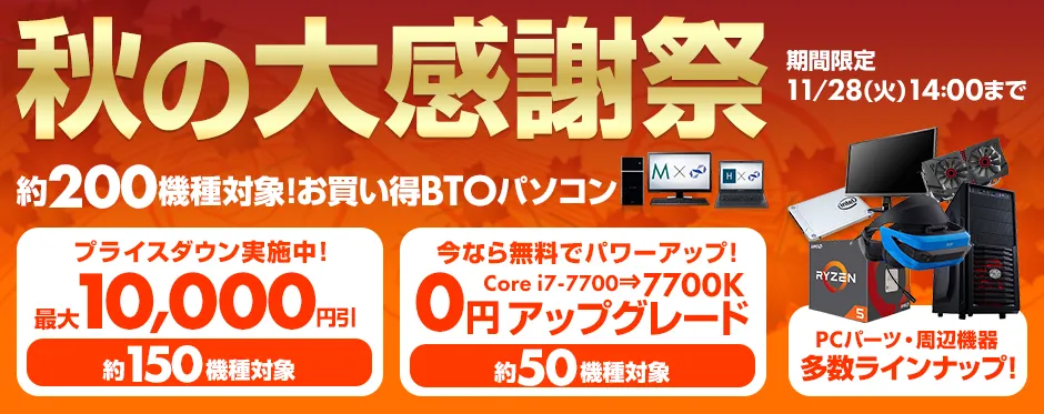 『 秋の大感謝祭 』では、厳選されたBTOパソコンが最大10,000円OFFと大幅プライスダウン!