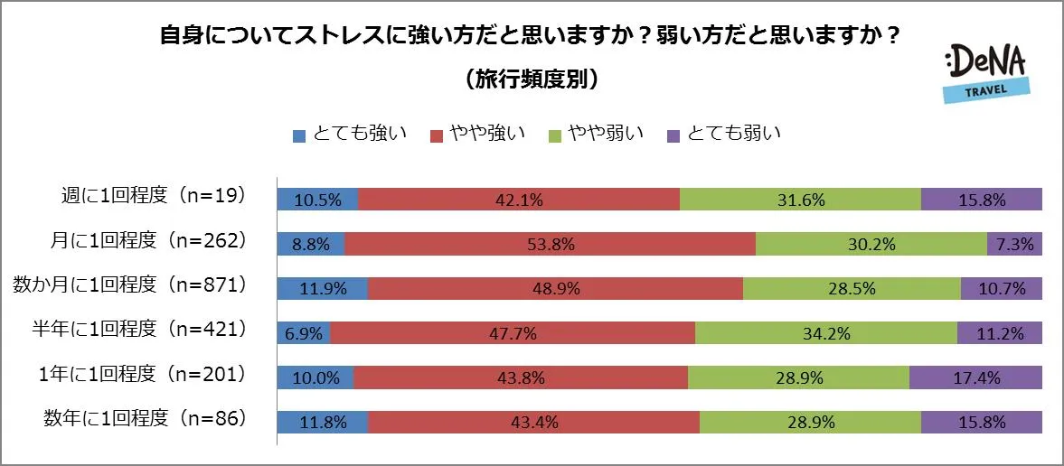 「自身についてストレスに強い方だと思いますか?弱い方だと思いますか?」という質問を旅行頻度別に集計したところ、明確な相関関係は見られませんでした。
