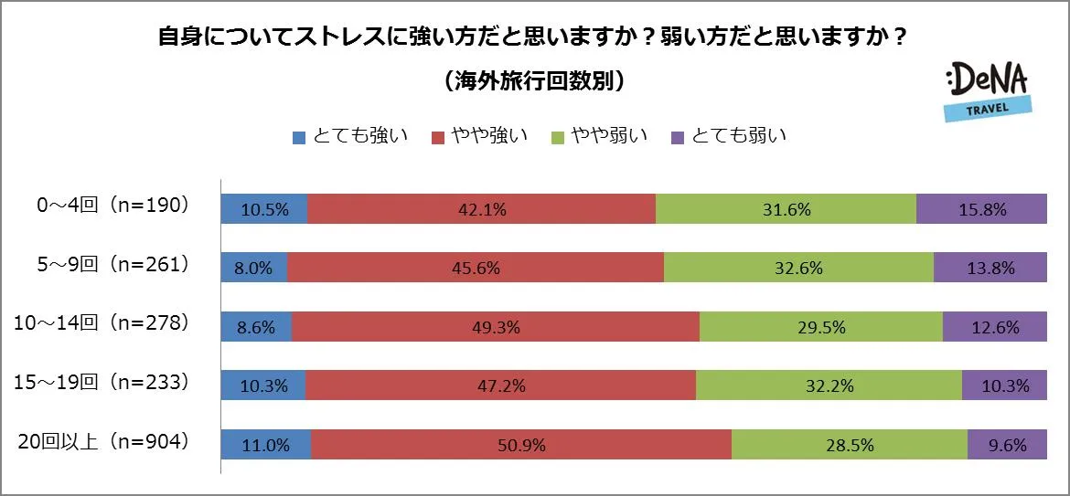 一方で、海外旅行回数別で比較したところ、ストレスに「とても強い」「やや強い」と回答したのが海外旅行回数「0~4回」の人は52.6%だったのに対し、「20回以上」の人は10ポイント近く高い61.9%となりました。ストレス耐性をつけるためには旅行頻度を高めるよりも海外旅行に多く行くことが重要だと言えそうです。