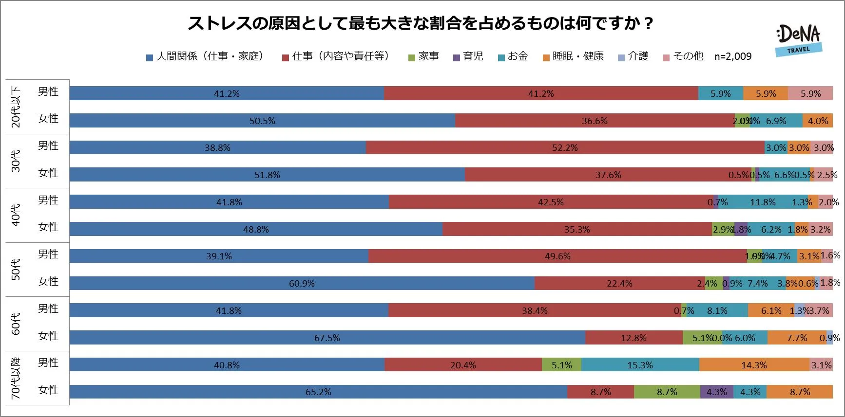 オンライン総合旅行サービス「DeNAトラベル」(http://www.skygate.co.jp)を運営する株式会社DeNAトラベル(本社:東京都新宿区、代表取締役社長:大見 周平)は、男女2,050名を対象に「ストレスと旅行」に関する調査を実施しました。