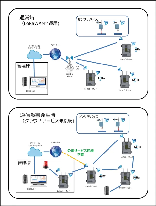 [上] 通常時(LoRaWAN(TM)運用)/[下] 通信障害発生時(クラウドサービス未接続)
