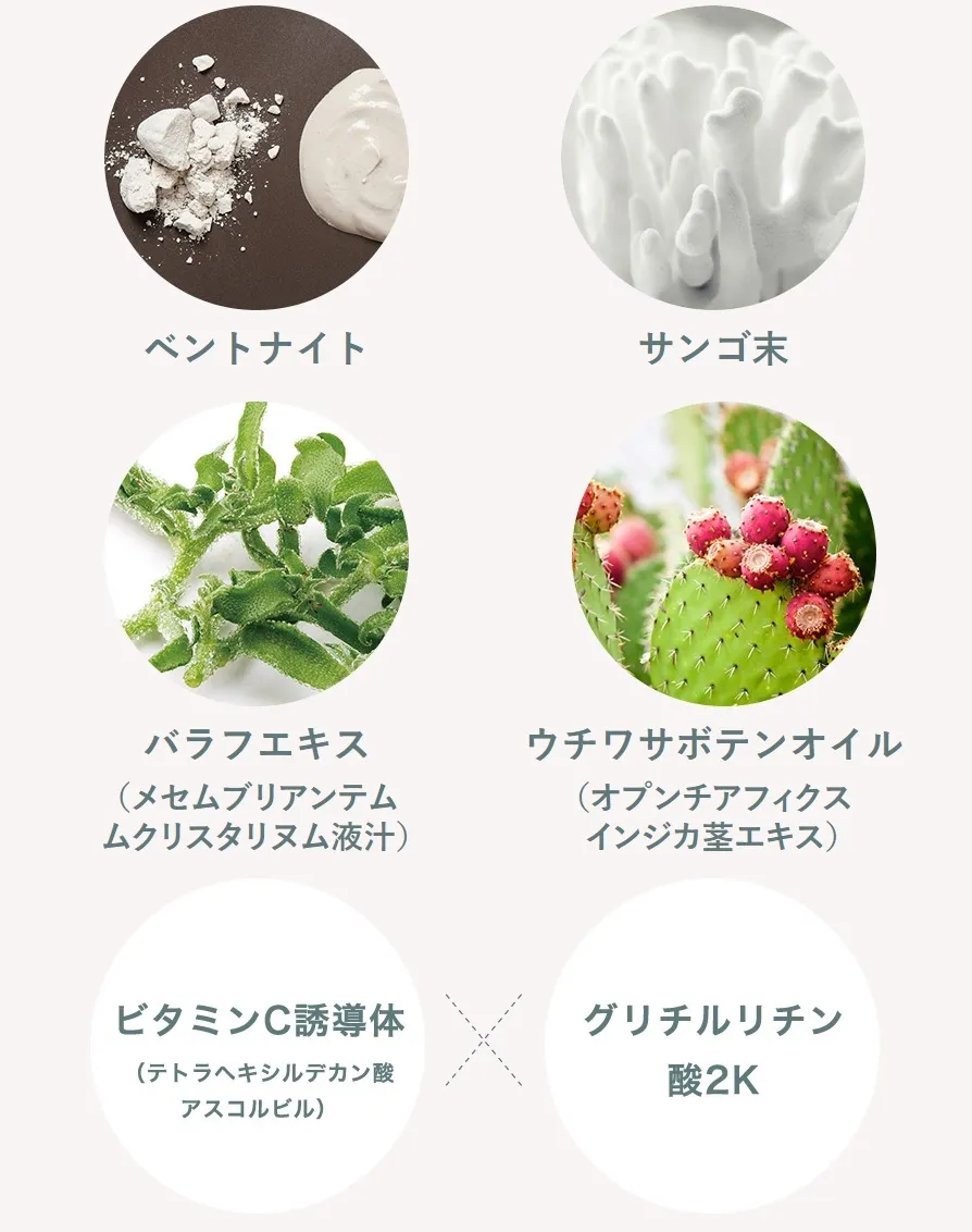 全成分:水、ラウロイルメチルアラニンNa、グリセリン、ココアンホ酢酸Na、コカミドDEA、デシルグルコシド、ラウリルグルコシド、アクリレーツコポリマー、ペンチレングリコール、オプンチアフィクスインジカ茎エキス、テトラヘキシルデカン酸アスコルビル、メセムブリアンテムムクリスタリヌム液汁、グリチルリチン酸2K、ベントナイト、サンゴ末、グリコシルトレハロース、加水分解水添デンプン、ラウリン酸ポリグリセリル-10、ポリクオタニウム-7、BG、オレンジ油、水酸化Na、フェノキシエタノール、トコフェロール