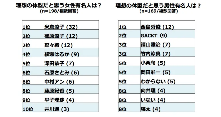 ■理想の体型女性No.1は「米倉涼子」。男性No.1は「西島秀俊」