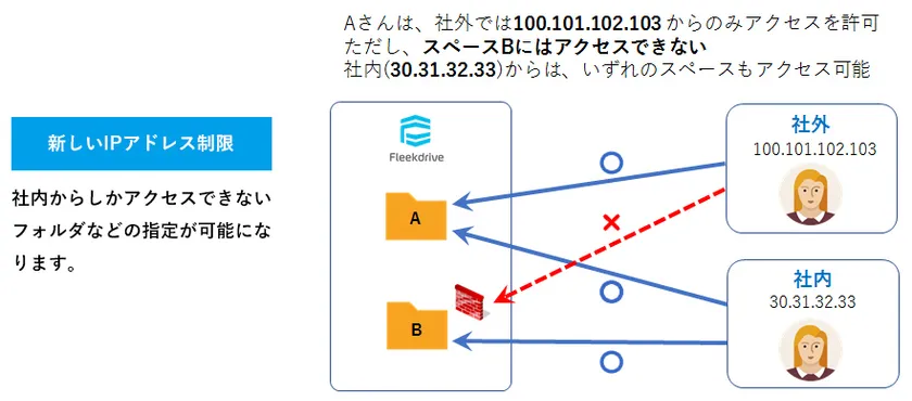 今回のバージョンアップでは、ユーザごと・スペースごとのIPアドレス制限が可能になりました。本社、支店、営業部門、研究開発部門、ビジネスパートナーなど、また、様々な場所やミッション環境で、更にセキュアなファイル共有を可能にします。