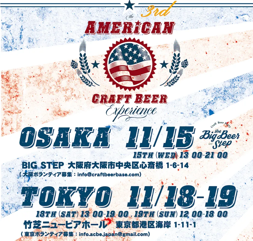 Brewers Association(アメリカ)、American Craft Beer Experience実行委員会は、2017年11月15日(水)には大阪(心斎橋BIG STEP)、11月18日(土)~11月19日(日)の期間には東京(竹芝NEW PIER HALL)にて、入場料無料でアメリカンクラフトビールを楽しめる『American Craft Beer Experience 2017』を開催いたします。