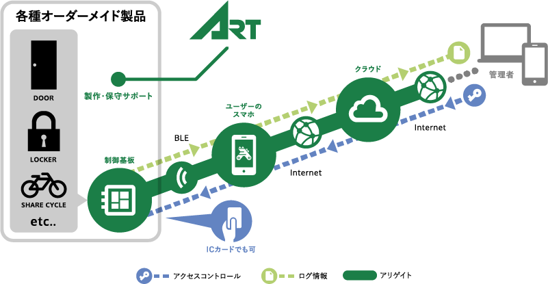 ALLIGATEはアクセスコントロールすることを目的とし、(1)電気錠のような機器に組み込み、電気的に鍵の施解錠制御を行う通信基板、(2)鍵の作成や配信・ログの管理などを行うクラウドサーバ、(3)通信基板とクラウドサーバをネットワーク接続するためのスマートフォンアプリケーション、(4)国内全域をカバーする保守サポート から構成されるアクセスコントロール専用のマネージド型プラットフォームです。ALLIGATEが提供する通信基板は電池で作動し、通信はスマートフォンを通して行います。この基板をベースにお客様の利用目的にあわせた配線レスの装置を提供し、電気錠はもとより、あらゆるモノをアクセスコントロール可能なスマートデバイスにすることができます。