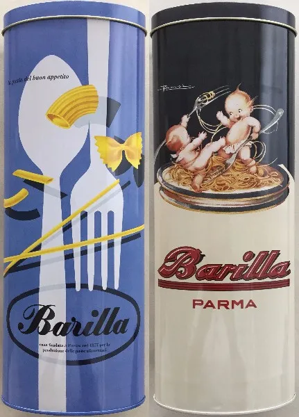 バリラ創立140周年を記念して、今回は2種類の限定缶を作りました。デザインは、バリラの広告ポスターを用いたもので1952年にエルベルト・カルボーニ(Erberto Carboni)氏によって作成されたポップでスタイリッシュな「BLUE(ブルー)」(写真左)と1931年にアドルフォ・ブーシー(Adolfo Busi)氏によってデザインされたレトロな「BLACK(ブラック)」(写真右)の2種類を展開いたします。
