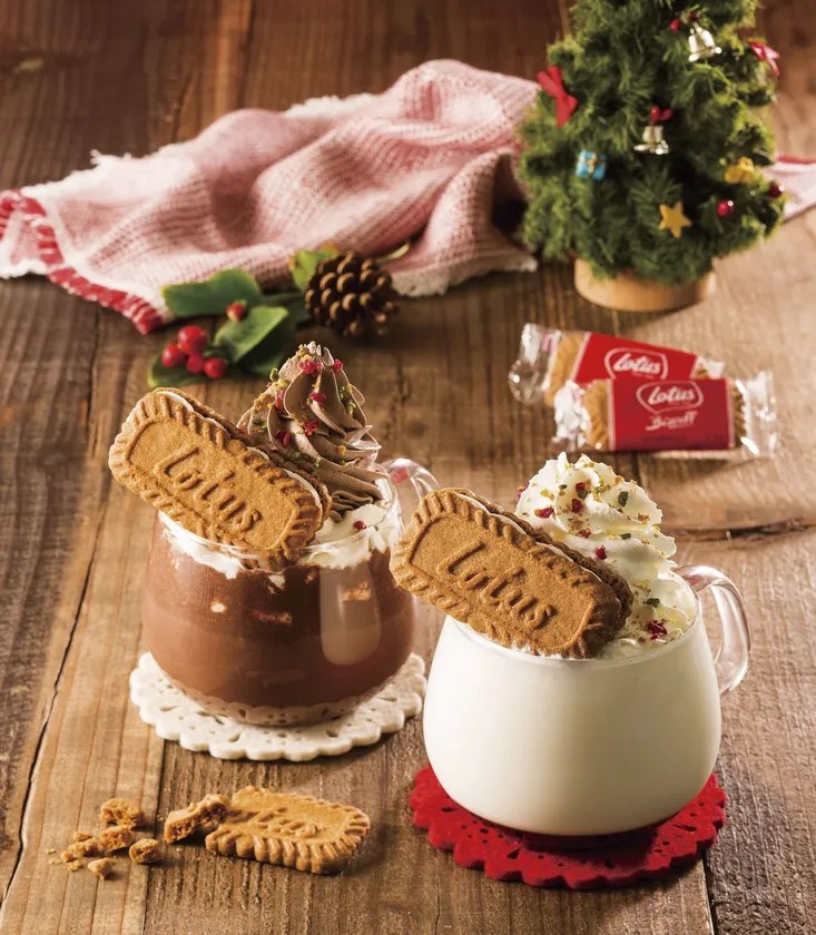 コラボクリスマスドリンク・イメージ:(左から)クリスマス・ブラックモカ with ロータスビスコフ・スモア、クリスマス・ホワイトラテ with ロータスビスコフ・スモア