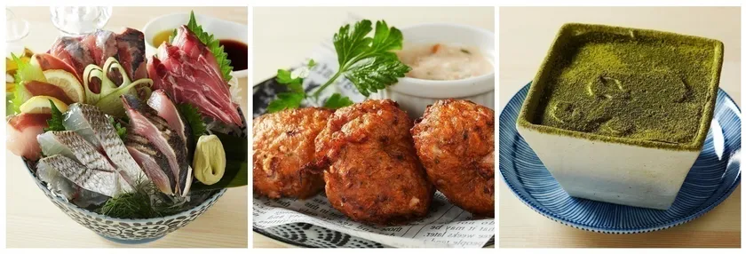 写真左:「刺身盛り合わせ」、写真中:「伊東名物ちんちん揚げ」、写真右:「静岡産グリ茶のティラミス」