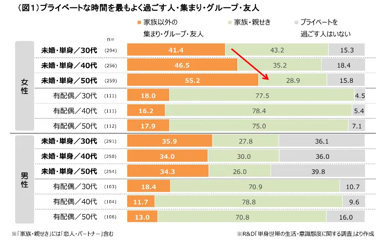・シングル(未婚・単身者)は、有配偶者と比較すると「家族以外」とプライベートの時間を過ごす割合が高い。シングル女性は年齢が上がると「家族以外」の割合が増加しており、50代シングル女性では半数以上を占め、「家族・親せき」を大きく上回る。有配偶男女や、シングル男性は年齢が上がっても大きな変化は見られない。(図 1)