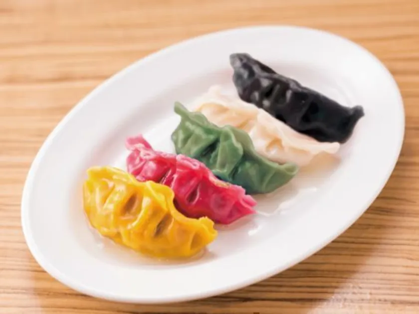 つるっとモチモチとした食感の皮の中には、ぎっしりと詰まったお肉。餃子を彩る5色は、イカ墨・ウコン・ほうれん草・唐辛子を使用しています。