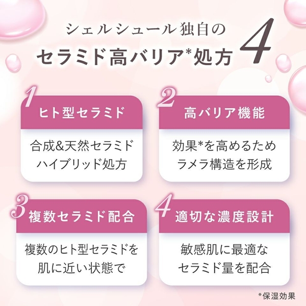 ヒト型セラミド(セラミド1・2・3・5・6II)とフィトスフィンゴシンをシェルシュール独自処方で配合しており、効果的にうるおいバリアを高めます。