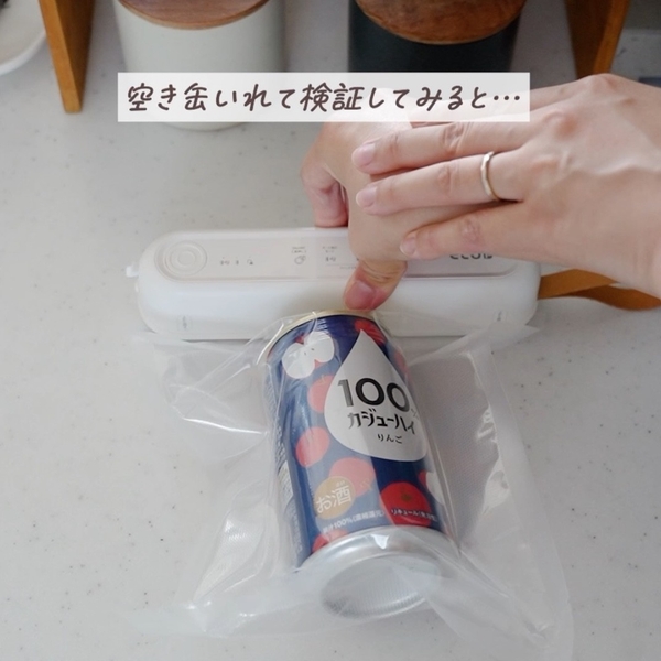 Susealの真空吸引力は本体の小ささに関係なくとても強力!袋の中の空気をしっかりと吸い込み、空き缶の中の空気もしっかり抜いてしまうので、吸引の力でぺちゃんこになってしまいます。