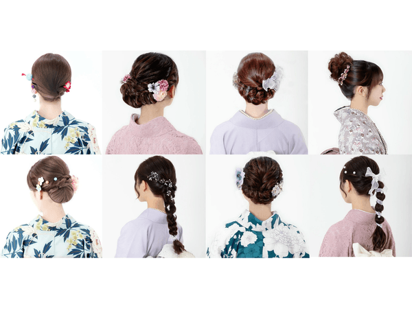 人気のスタイルカタログ(8パターン)からお好きなものをお選び頂けます。着物やイメージに合わせて当日選んでも大丈夫です。