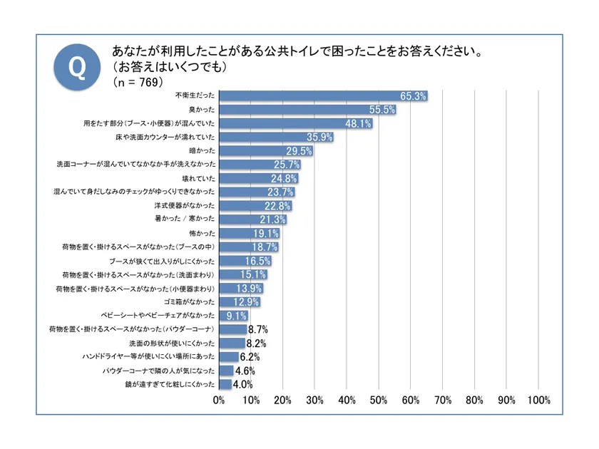 《11月10日はトイレの日》 トイレで困ったことベスト3「不衛生」「臭かった」「混雑」 汚いトイレは、「施設へのイメージダウン」が6割超え 男性トイレの完全個室化賛成は、4割超え ~トイレの快適利用に関する意識調査を発表~