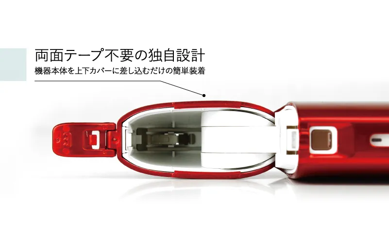 一般的にIQOS全体を保護するケースは、蓋部分はどうしても両面テープ等で固定する必要がありました。しかし本製品では蓋部分にも独自の構造を開発し、両面テープを使う必要なく簡単に装着できるようになりました。もちろん取り外しも簡単です。