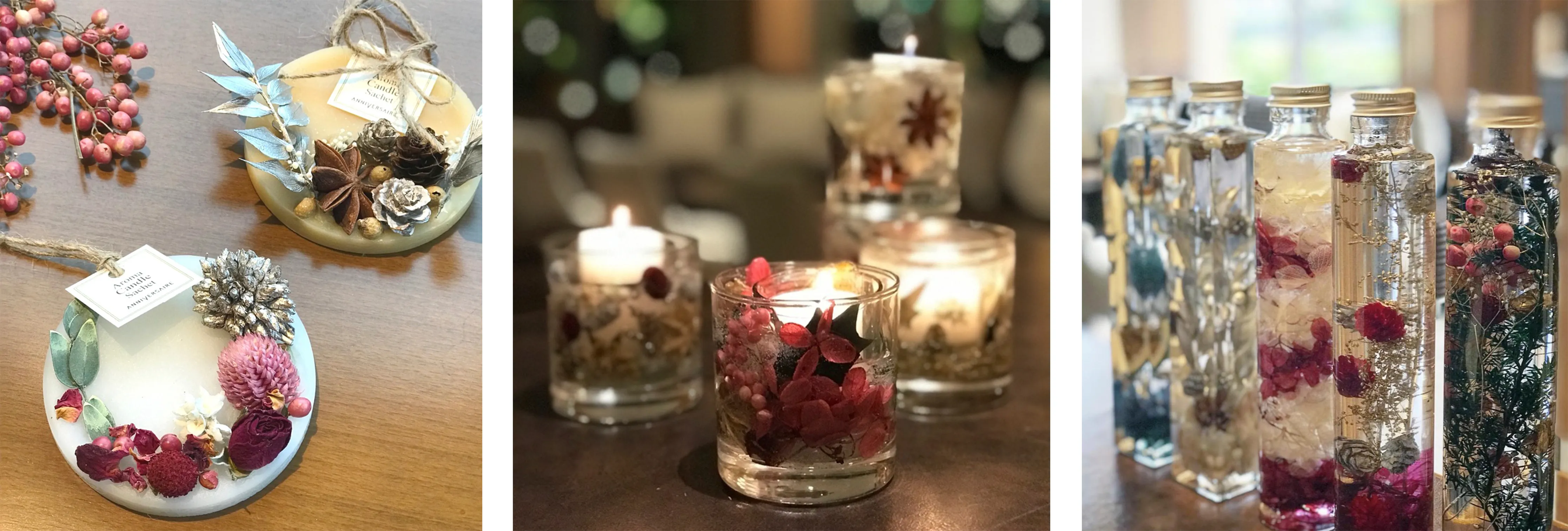 (左から、キャンドルサシェ、ジェルキャンドル、ハーバリウム)