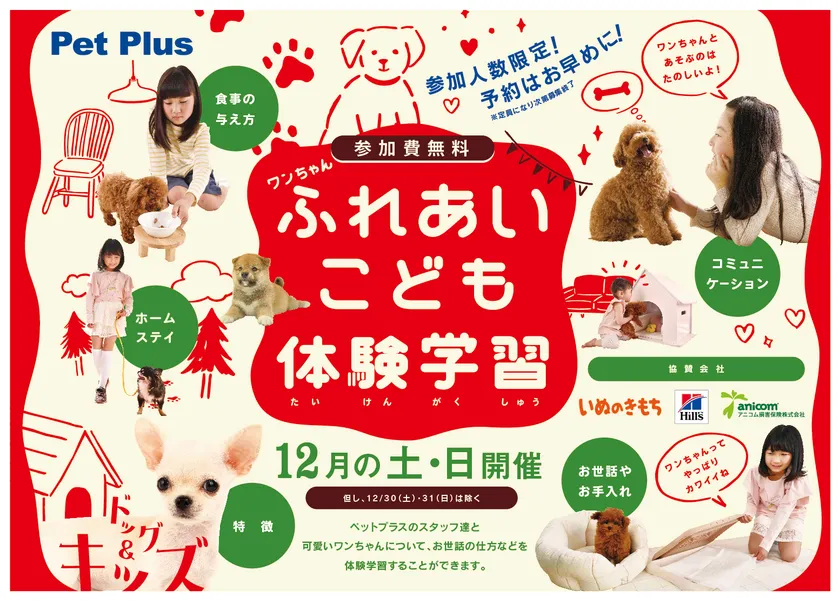 全国チェーンのペットショップ「PetPlus(ペットプラス)」を運営する株式会社AHB(所在地:東京都江東区、代表取締役:川口 雅章)は、小学生を対象にした参加費無料の情操教育体感イベント「ワンちゃんふれあいこども体験学習」を、2017年12月の毎週土日に全国77店舗で開催いたします。