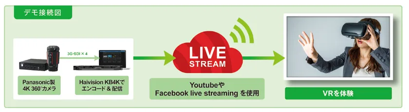 今回、PALTEKが提供する4K対応360°VR動画配信ソリューションは、Haivision社の4K対応H.264/AVCエンコーダ装置「KB-4K」と4K 360°カメラにより構成されます。4K 360°カメラで撮影した動画をエンコーダ装置で圧縮し、IPネットワーク網経由でYoutubeライブストリーミングへアップロードすることができます。アップロードされた4K 360°動画は、市販されているVRゴーグルなどを用いてライブで視聴することが可能です。今後、Facebookライブやその他のストリーミングサービスへの対応も予定しています。