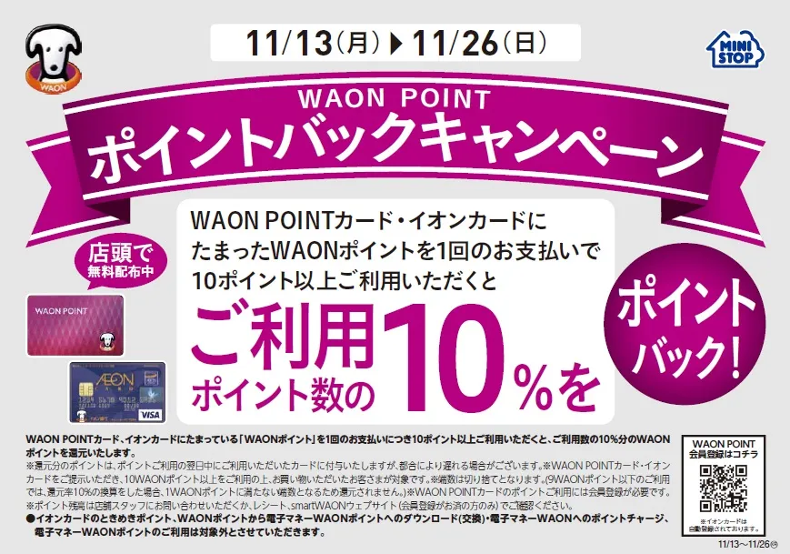 ミニストップでは、「WAON POINTカード」および「イオンカード」にたまっている「WAON POINT(ポイント)」をお買い物時レジにて10ポイント以上ご利用いただくと、ご利用ポイント数の10%分の「WAON POINT(ポイント)」を付与(ポイントバック)するキャンペーンを実施します。この機会にミニストップのお店で“たまったポイントを利用”することで“ポイントがもらえる”お得なキャンペーンを是非ご利用ください。