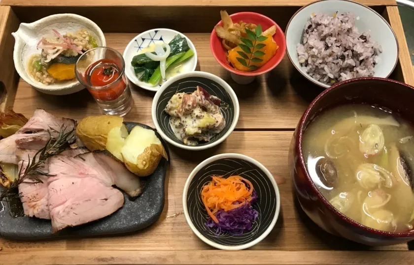 特製やわらかローストポーク、小鉢5種、雑穀米(or玄米)、味噌汁、食前酒