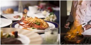 活オマール1尾のグラチネと三大珍味、神戸ビーフのフランベ など