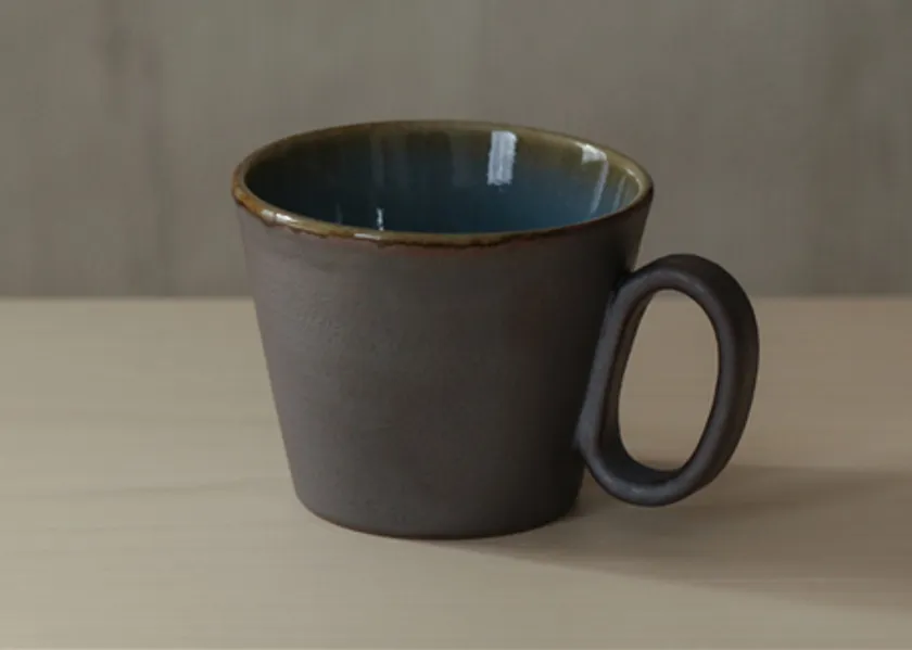 「生涯を添い遂げるマグ 楢岡焼」は、楢岡焼の伝統的な技術である海鼠釉(なまこゆう)を活かしつつ、マット鉄釉をカップ外側に施すことで、武骨でクールな表情、独特なマットな質感を力強く表現しました。それにより、内側に施した吸い込まれるような深い青色の海鼠釉の柔らかい表情、安心感をより際立たせています。