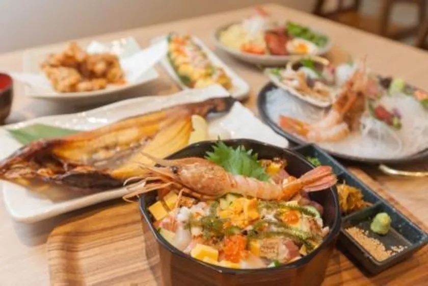 ランチタイムはウニ・カニ・イクラなどを使った12種類の丼を提供する海鮮丼専門店、ディナータイムは刺身やザンギを地酒とともに楽しんでいただく居酒屋として営業。団体様も歓迎の95席!
