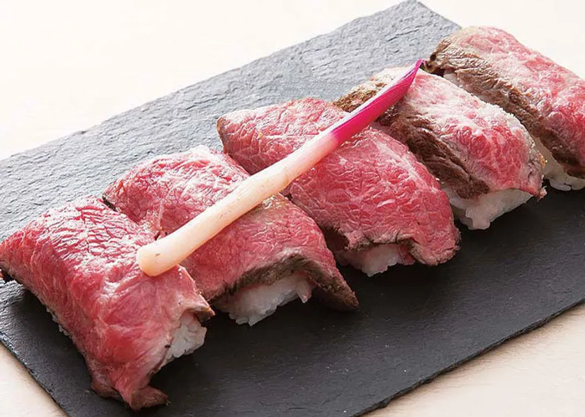 飼育から販売までを手掛け、尾花沢牛の魅力を伝える人気焼肉店から、とろけるようなステーキとローストビーフの【東武限定】握りずしが登場です。