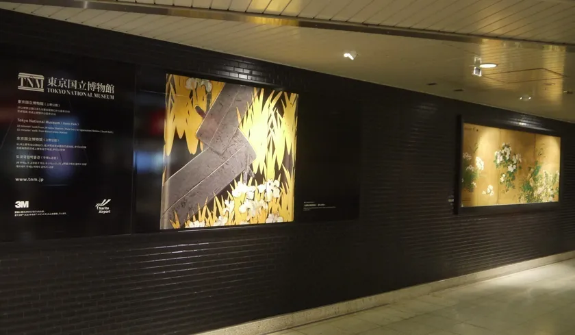 ミニギャラリーは第1ターミナル1Fの到着ロビーから、鉄道の改札があるB1Fに移動する2ヶ所の通路に設置。東京国立博物館所蔵の日本を代表する美術品を印刷したフィルムを、壁と天井に施工しました。