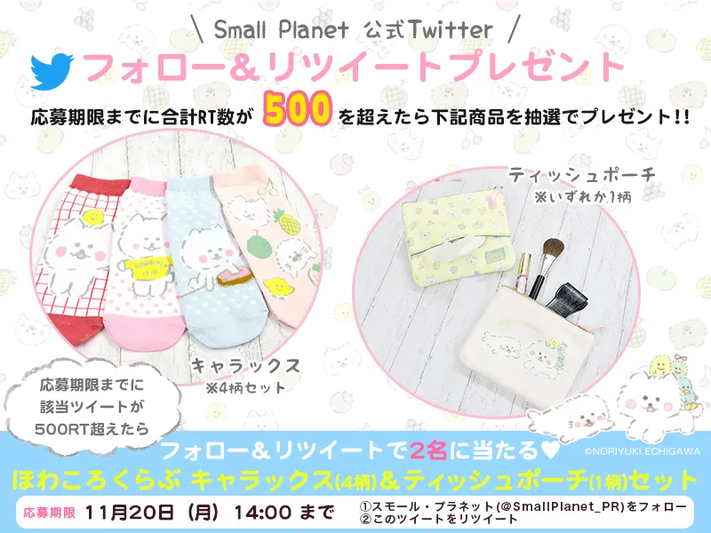 スモール・プラネットの公式Twitterアカウント(@SmallPlanet_PR)をフォローして、対象の投稿をリツイートしていただいた方の中から、抽選で2名様に、11月下旬より発売の「ほわころくらぶ」キャラックス4柄とティッシュポーチ1柄をセットでプレゼントいたします。