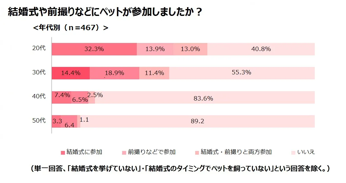 そして、年代ごとの内訳を見ると、年代が若くなるにつれ、結婚式や前撮りにペットが参加する割合が高くなることが伺えました。ちなみに20代では59.2%がペットと結婚式や前撮りに参加した経験があると回答しました。ペットの位置づけが家族の一員となってきていることや、近年の結婚式の多様化も見える結果となっているのではないでしょうか。