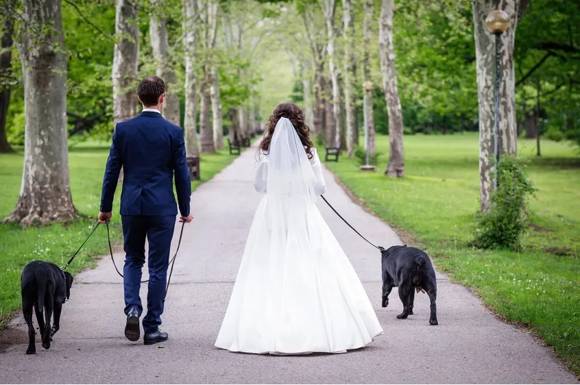 実際に、ペット可の式場や前撮りプランを用意する式場もあるようです。わんちゃんに結婚指輪を運ぶ大切な役割を行なってもらう「リングドッグ」や、証人ならぬ証犬として結婚証明書に肉球でサインする「肉球スタンプ」などの演出に参加してもらうことなどもできます。また、参列者の方のアレルギーの有無や式場の都合などによって、式への参加は難しい場合には、前撮り写真で思い出を残す方もいるようです。