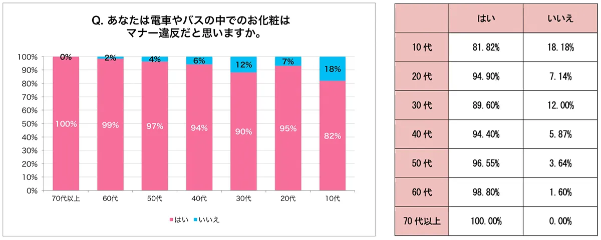 この問いに対して、女性の約2割の人が「はい(電車やバスの中で化粧したことがある)」と回答しました。