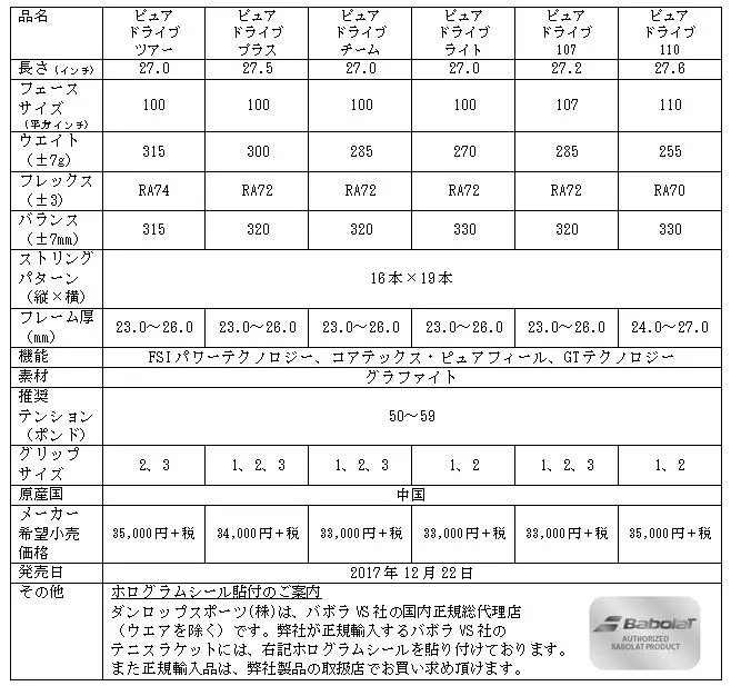 ダンロップスポーツ(株)は、日本での販売総代理店契約をしているバボラVS社(Babolat VS、本社:フランス、社長:エリック・バボラ Eric Babolat)の、テニスラケットNEW「ピュア ドライブ」シリーズ6機種を、12月22日より順次発売します。
