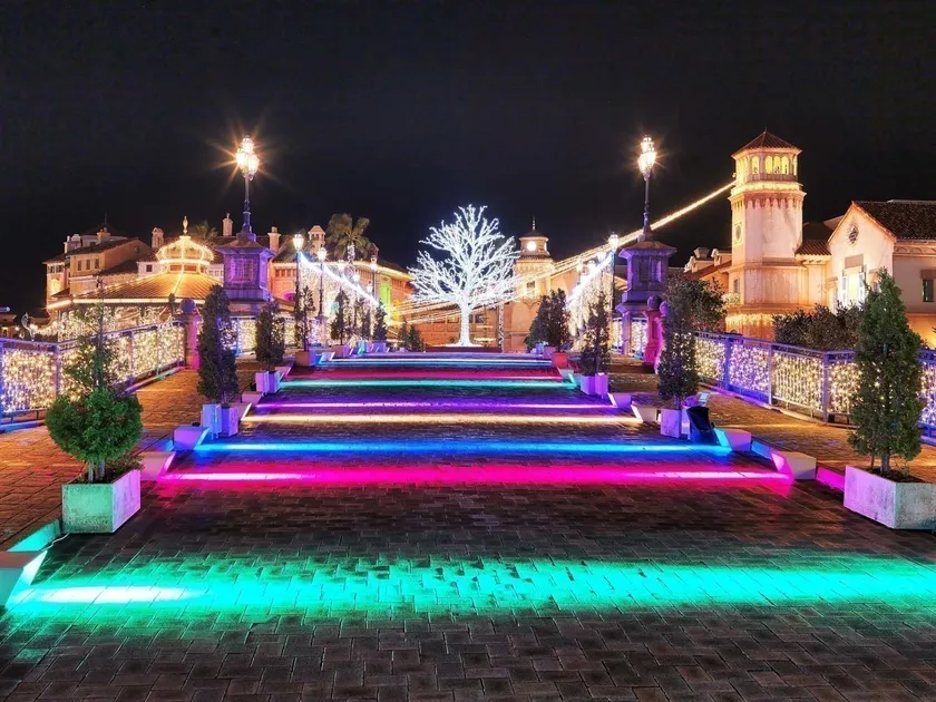 会場内の橋を5mを超える光のツリーとカラフルな光でライトアップ