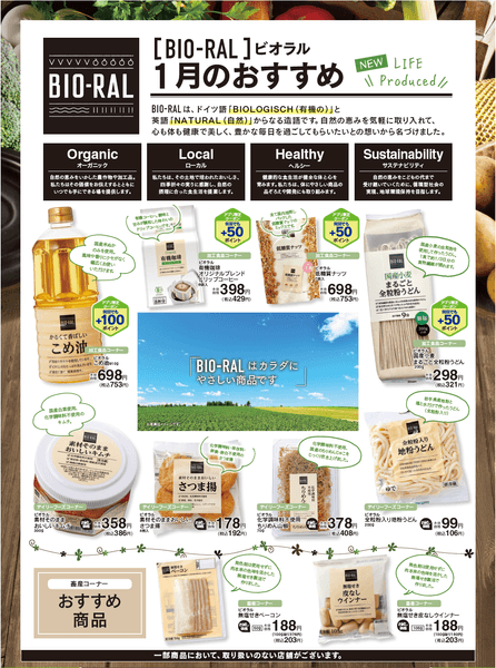 「オーガニック」「ローカル」「ヘルシー」をコンセプトにこだわりの商品を取りそろえています。首都圏ライフ122店舗にて、1月4日(火)から31日(月)までお試し価格にて販売、もしくはアプリ限定クーポンをご使用いただくとライフポイントをプレゼントするなど、お得にお買い求めいただけます。「こだわりのBIO-RAL商品に興味があるけど買ったことがない」というお客様も、ぜひこの機会にお試しください。