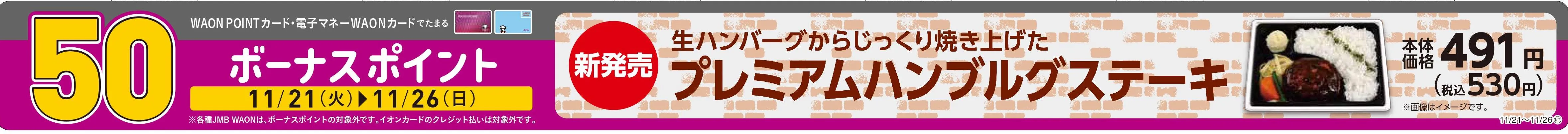 ■キャンペーン内容:期間中、プレミアムハンブルグステーキをお買い上げいただくと、WAON50ボーナスポイントをプレゼントします。