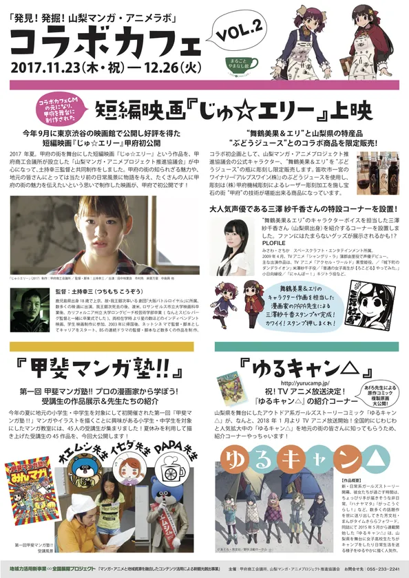 2017年夏。甲府商工会議所、山梨マンガ・アニメプロジェクト推進協議会は、山梨県甲府市の街の魅力をたくさんの人に伝えたいという想いから、地元甲府を舞台にした短編映画を制作しました。地元甲府市の人々にとっては日常的な場所を物語の舞台にして、山梨県立宝石美術専門学校の主人公の学生を中心に、将来に悩む地元の若者たちが共に奮闘する青春ストーリーです。また、山梨マンガ・アニメプロジェクト推進協議会のオリジナルキャラクター、舞鶴美果(まいづるみか)&エリの誕生秘話もこの物語に隠されており、短編映画の中で産まれたキャラクターが、実際のイベントで活躍するという、短編映画の世界と現実とリンクする仕掛けを施しています。さらに、劇中で登場する“舞鶴美果(まいづるみか)&エリ”のキャラクターボイスを担当し、山梨県を代表する大人気声優「三澤紗千香さん」の紹介コーナーも展示します。イベント開催期間の2017年11月23日(木・祝)~2017年12月26日(火)、短編映画「じゅ☆エリー」を無料公開します。