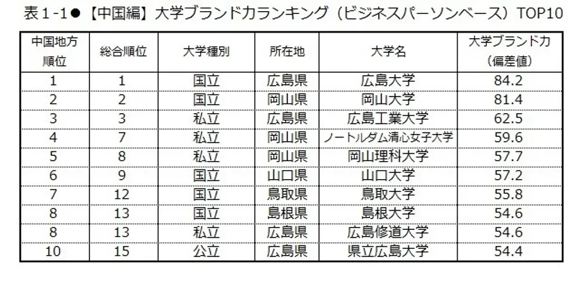 日経BPコンサルティングの提携先調査機関の調査モニターを中心に、同地域に居住し、仕事をしている方(ビジネスパーソン)や、中学生以上の子どもがいる父母、教育関連従事者に回答を依頼。「地域産業への貢献度」や「研究施設の充実度」、また学生の「語学力」や「コミュニケーション能力の高さ」など大学や学生へのブランド・イメージ49項目を測定。それらから大学ブランド力(偏差値)を算出してランキング化した。調査設計や分析にあたり、企業ブランドおよび製品/サービスブランドの調査で実績のある「ブランド・ジャパン」で培ったノウハウを活用。調査するイメージ項目を洗い出した。調査期間は2017年8月2日~8月31日、本リリースで結果を掲載したビジネスパーソンの有効回答数は、2,734件(中国・四国編)。2017年11月29日に地域ごとの調査結果をリリース。