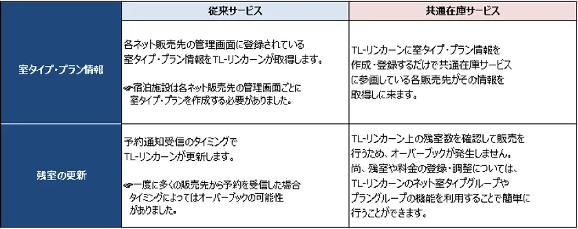 越後湯沢温泉観光協会が運営するポータルサイト「SNOW COUNTRY TOURISM」の部屋タイプやプランを、TL-リンカーンの共通在庫サービスを使って作成、同システムで管理されている他のネット販売先と共有を行うことで、残室・料金の一括調整が可能になります。これまでの通知受信連携による予約情報のデータ化とあわせて、よりシームレスな残室・料金管理を実現することができ、TL-リンカーン導入施設は手間なく販売チャネルを広げることができます。