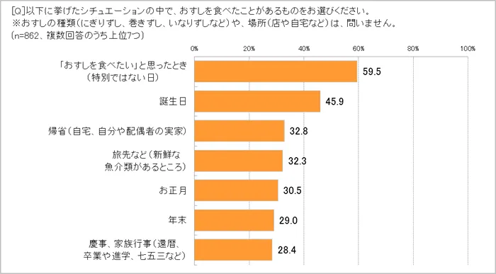 にぎりずし、巻きずし、いなりずしなどのおすしの種類や食べた場所は問わず、「どのシチュエーションでおすしを食べたか」では「食べたいと思ったとき(特別ではない日)」が59.5%で1位。次に「誕生日」45.9%、「帰省(自宅、自分や配偶者の実家)」32.8%、「旅先など(新鮮な魚介類があるところ)」32.3%、「お正月」30.5%、「年末」29.0%となりました。