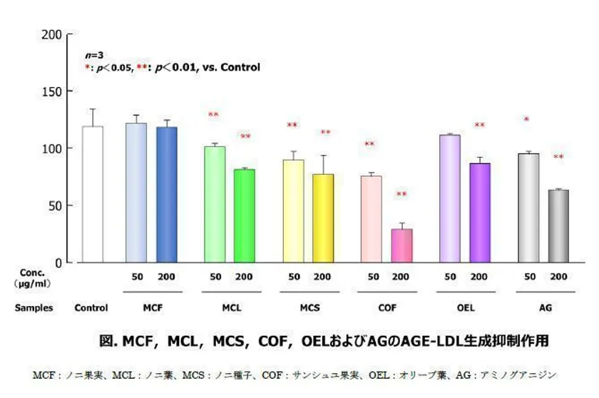 LDLとグリセルアルデヒドをin vitro(試験管内)にて2日間反応させ、AGE生成量を確認した。次に、すでにAGEs生成抑制作用を持つことが知られているイリドイド含有植物であるノニ(Morinda citrifolia)、サンシュユ(Cornus officinalis)およびオリーブ(Olea europaea)のAGE-LDL生成抑制作用をアミノグアニジン(AG:抗糖化物質)と比較し、検討した。